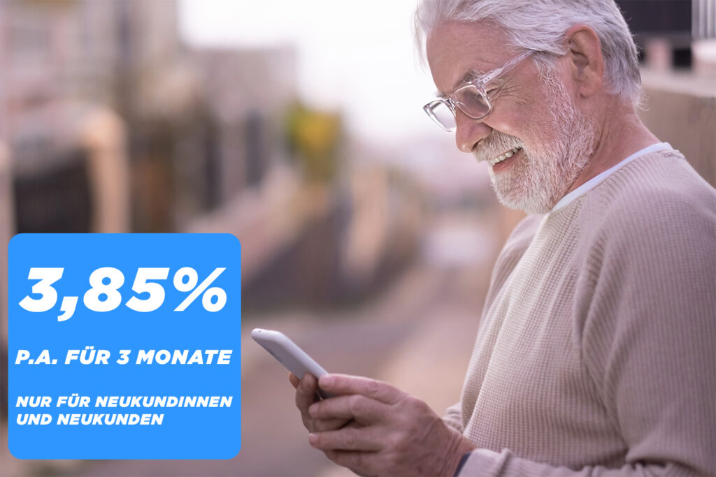 Lassen Sie Ihr Geld für sich arbeiten mit unserem exklusiven Tagesgeld-Angebot für Neukunden: 3,85 % p. a. Zinsen. Jederzeit verfügbar. Ohne Gebühren.